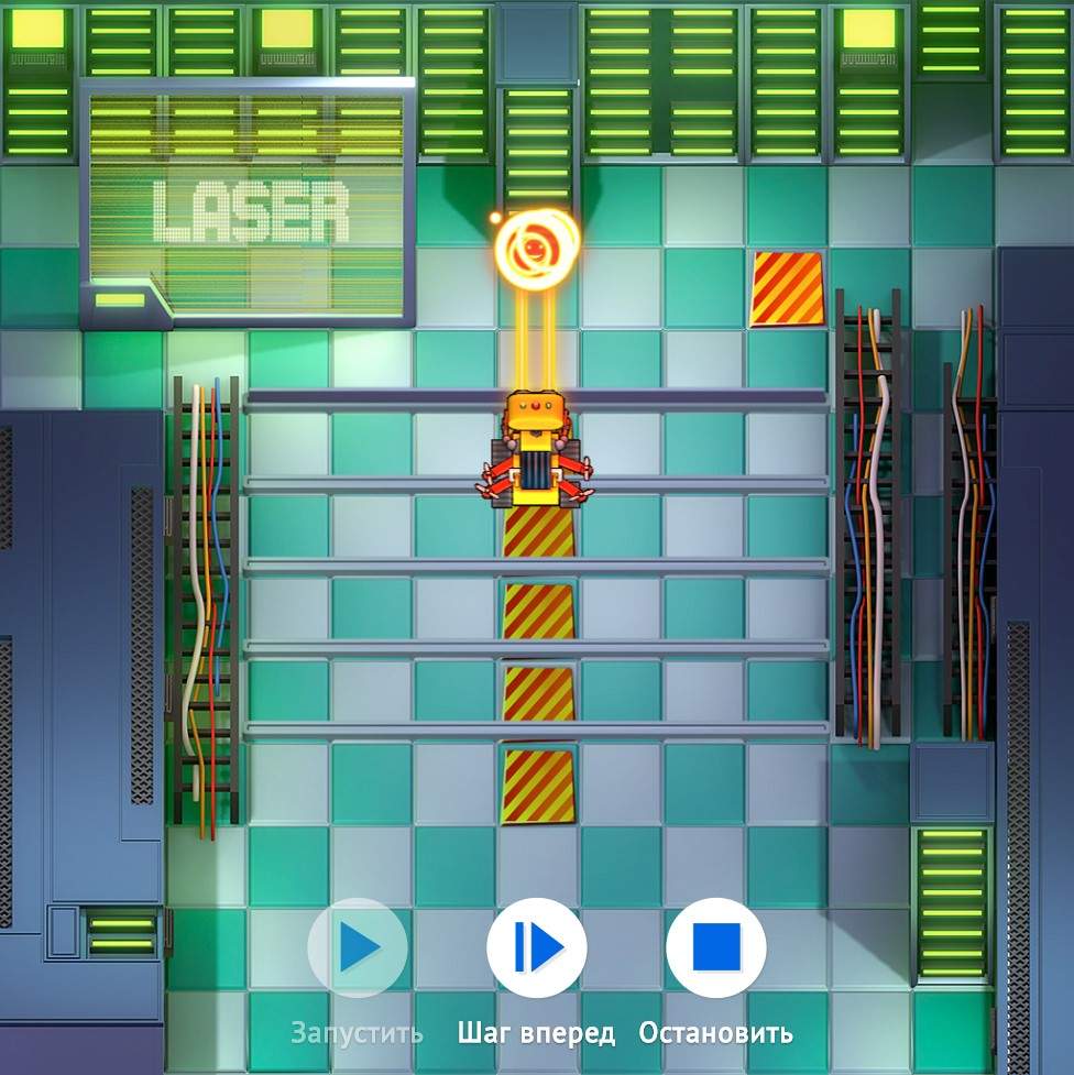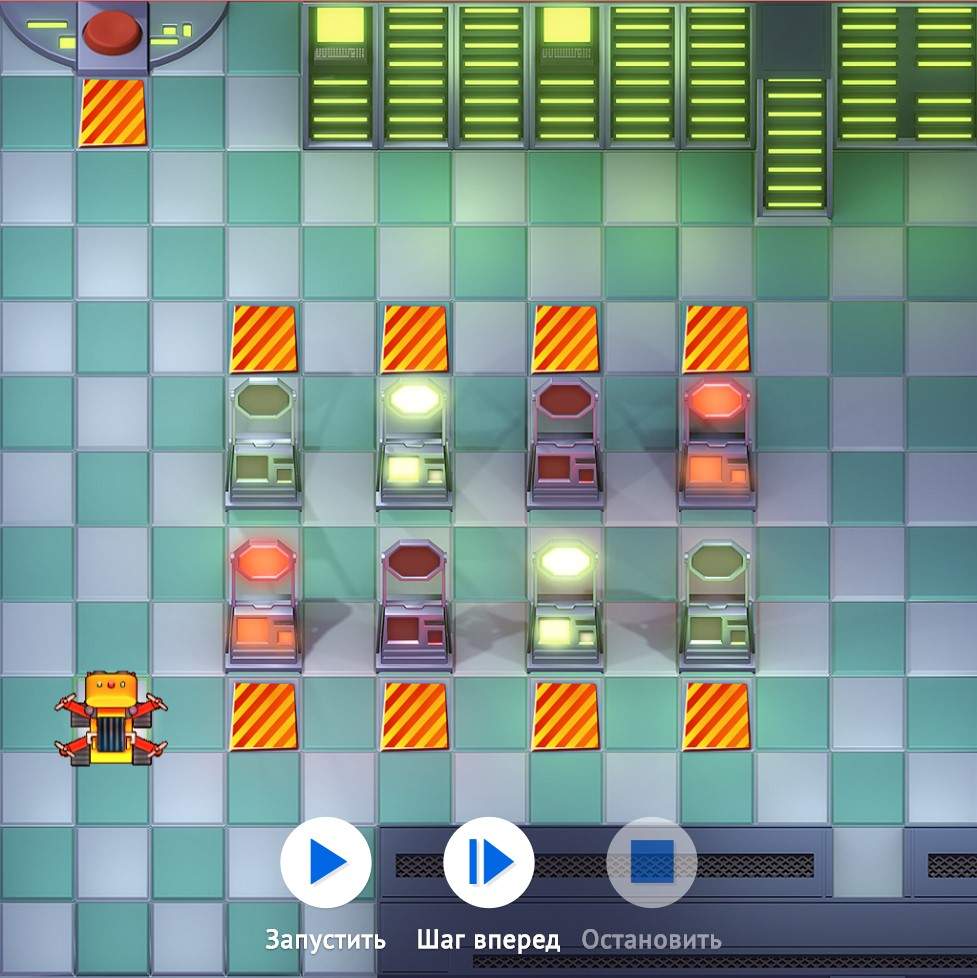 Теперь нужно провести обслуживание перегруженных серверов. Запусти диагностику, а потом проверь, если горит красным – нужна перенастройка. Если не горит, можно проехать дальше. Для начала роботу нужно подъехать на выделенную клетку и использовать команду tracert, которая запустит диагностику серверов. Далее нужно поочерёдно подъезжать к каждому серверу. Если (if) лампа на нём горит красным - то требуется перенастройка сервера. Если (if) зелёный - то можно проехать дальше. Не забывай использовать циклы, а ещё команду if, чтобы правильно и оптимально запрограммировать робота. Конструкция if (если) поможет работать с неопределенностью.
