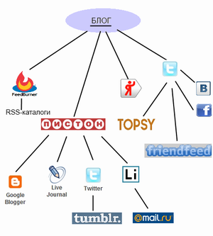 Ещё один новый элемент продвижения - кросспостинг. Принцип заключается в том, что каждая статья на сайте автоматически отправляется в десяток социальных сетей и блогов на официально связанные с сайтом страницы. Для этого существует ряд кросспостинг-сервисов, например, pistonposter.com. В бесплатном режиме на Пистоне можно зарегистрировать одну входящую rss-ленту для получения статей с сайта и 7 блогов для постинга. Подключить можно Twitter, Facebook, Я.ru, Мой мир, Blogger, LinkedIN и ещё несколько менее известных. Смысла платного использования сервиса я для себя не увидел, поэтому ограничился настройкой шести блогов из семи возможных. Пришлось зарегистрироваться на LinkedIN и в МойМир. Остальные аккаунты у меня были и понадобилось только привязать их к Пистону, что заняло меньше пяти минут на всё.