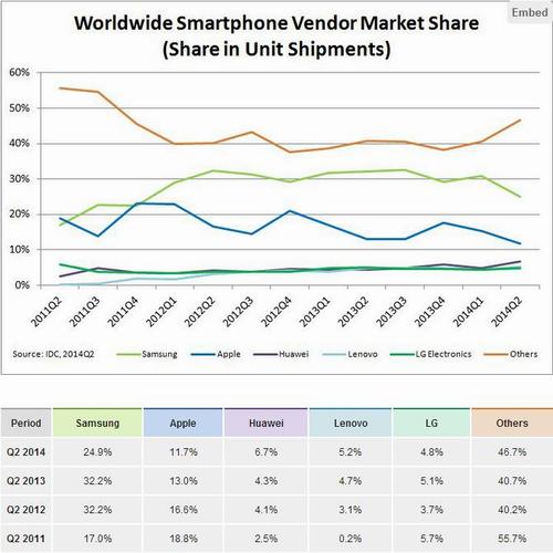 И, как сообщают надёжные источники, в подвалах Шеньженьской лаборатории готовится к выходу Hisilicon Kirin 930, который будет выполнен аж по 16нм техпроцессу, а значит быть ему мощным, выосокпроизводительным, и при этом энергоэффективным и малогреющимся! Фантастика? А почему нет? Интел же переходит на 14-нм техпроцесс, вот и китайцы решили подтянуть технологии. Тем паче, деньги появились, ведь Huawei в последние годы хорошо развернулся: занял третье место по доле мирового рынка смартфонов сразу после Самсунга и Apple (которые, кстати, неуклонно падают), слегка обогнав дряхлеющий LG и дорвавшийся до пятёрки Lenovo. Да посмотрите сами на график: кажется, тут ясно, кто стрижёт бабло, а кто сосёт палец страдает от нехватки бюджетных средств...