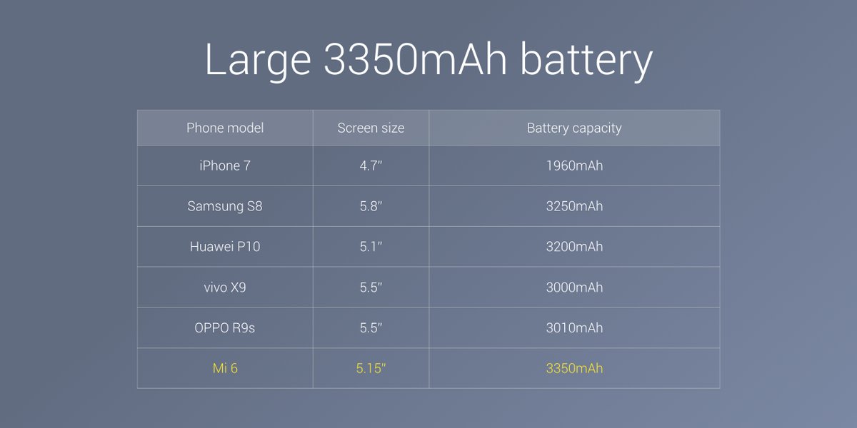 Емкость аккумулятора составила 3350 мАч, что больше чем у предшественника Mi5s на 150 мАч. Емкость, откровенно говоря, невысокая, но учитывая разрешение дисплея, ее достаточно. Как пообещали в Сяоми, при плотном использовании от одного полного заряда смартфон проживет целый рабочий день, а в режиме среднего использования полтора дня вам обеспечены. Если же взглянуть на таблицу, то видно, что флагманы конкурентов в этом плане ничуть не лучше, даже поигрывают немного.