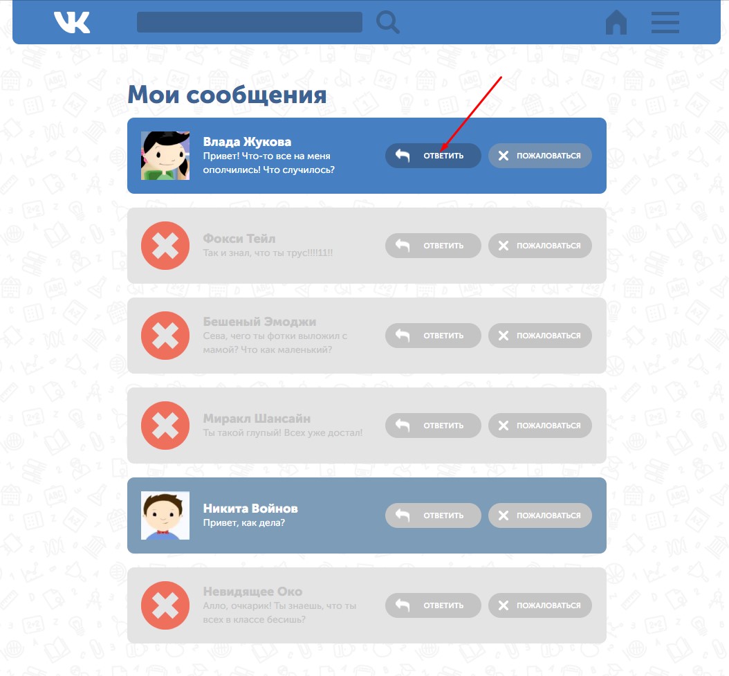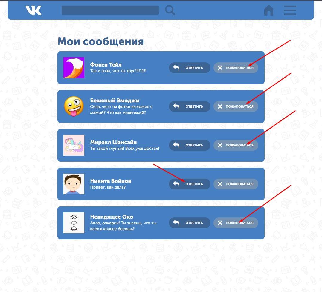 Затем переходим в Личные сообщения и жалуемся на все сообщения, кроме Никиты Войнова - это ваш друг и ему нужно ответить (смотрите картинки).