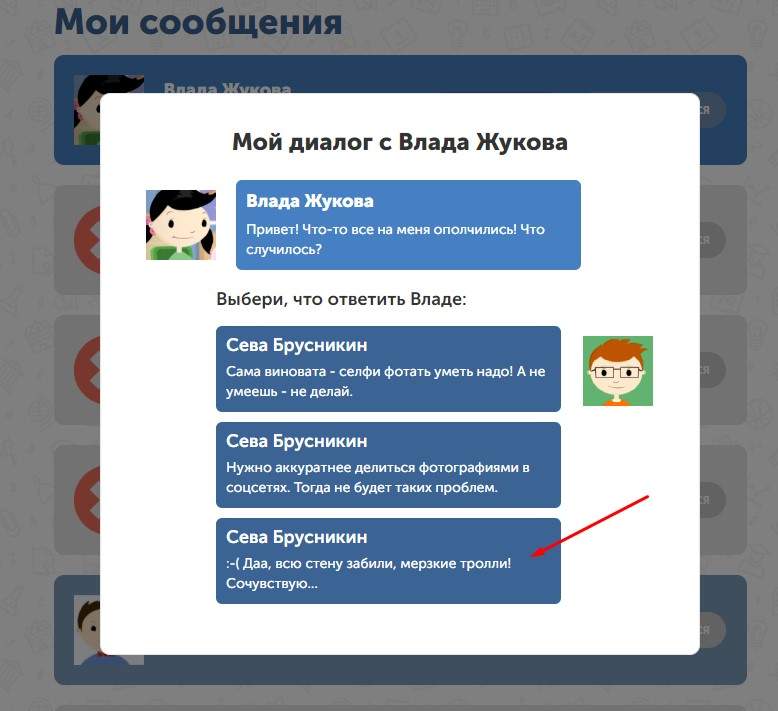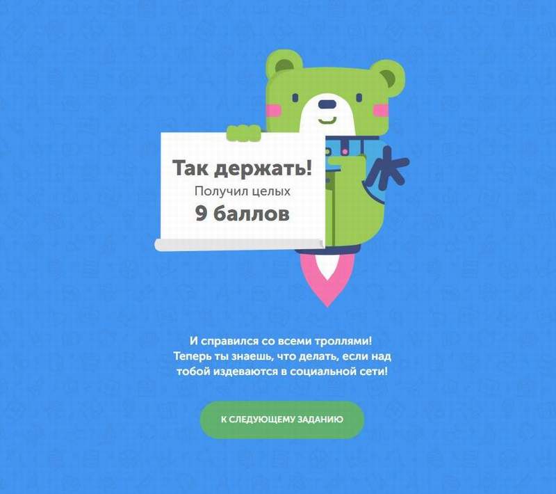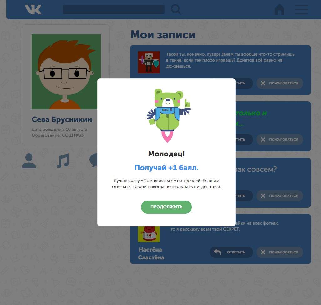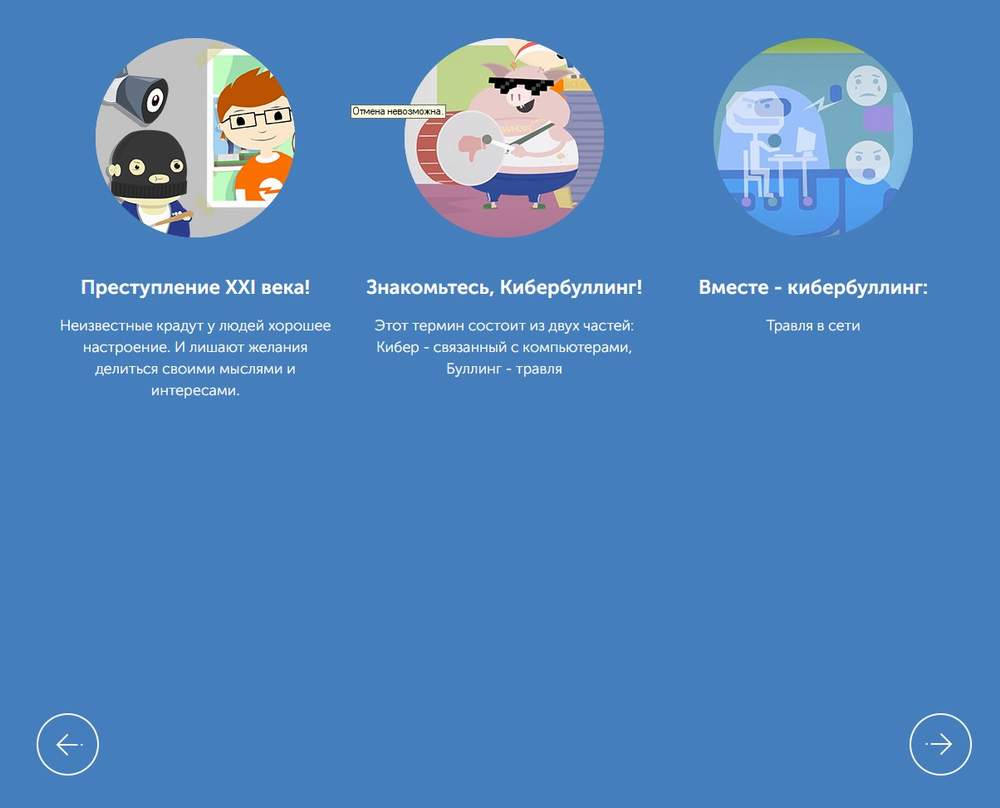 В самом начале первого этапа рассказывается о том, что такое кибербуллинг. Коротко - это травля в сети. Проявляется кибербуллинг в виде злых комментариев, которые высмеивают вас или ваших знакомых, причем делают это совершенно незнакомые вам люди - у всех троллей фейковые аккаунты.