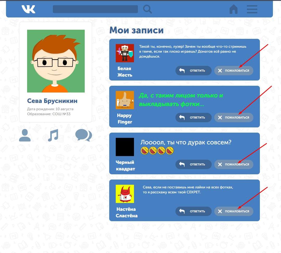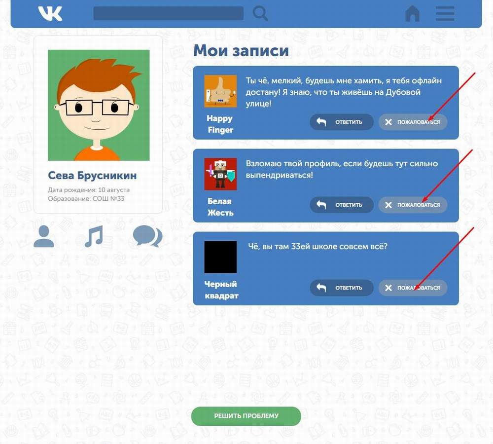 Посмотрев видео и зайдя на страничку Севы Брусникина вам придется применить на практике все то, о чем вам рассказывали раньше. В первой задаче вам нужно пожаловаться на всех троллей (смотрите картинки). За это вам начисляют баллы.