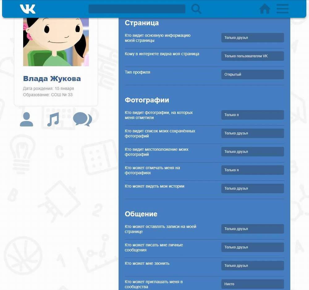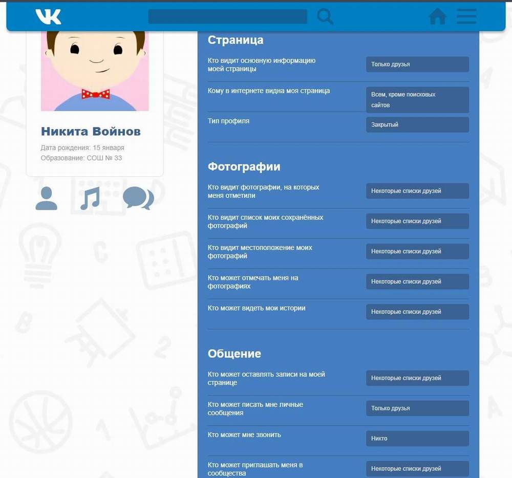 На этом этапе вам нужно помочь друзьям, настроив их "Настройки приватности" во Вконтакте таким образом, чтобы им не смогли писать мошенники или тролли, а также не могли украсть их личные данные или вещи. Настраиваем странички во Вконтакте своих друзей так, как показано на картинках ниже.