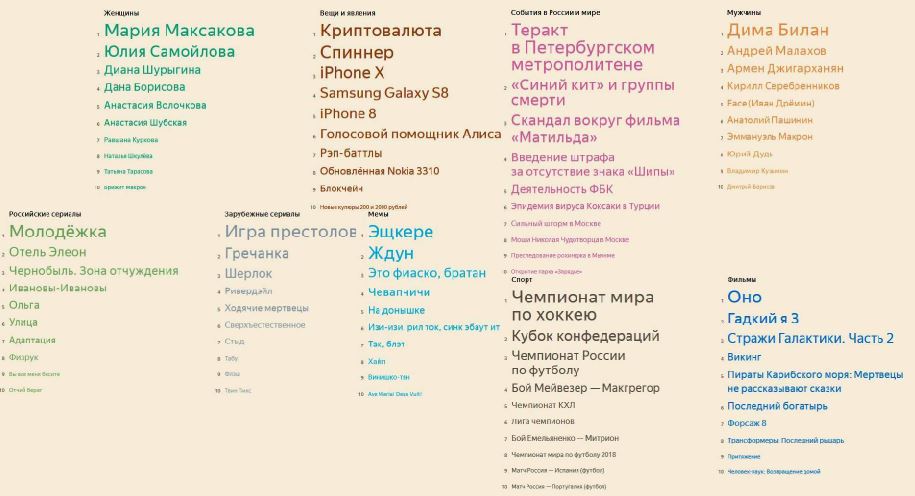Начнем с основных событий в РФ и мире. Открывает топ-10 запрос, связанный с терактом в метро Питера, произошедший в начале апреля. Второе место досталось распространенной на просторах Вконтакте игре Синий кит и группам смерти. Шум вокруг премьеры киноленты Матильда не прошел бесследно, поэтому специалисты, составляющие топ-лист запросов, отправили фильм на третье место.